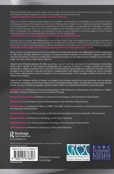 There is broad acceptance across the Humanities and Social Sciences that our deliberations on the social need to take place through attention to practice, to object-mediated relations, to non-human agency and to the affective dimensions of human sociality. This Companion focuses on the objects and materials found at centre stage, and asks: what matters about objects? Objects and Materials explores the field, providing succinct summary accounts of contemporary scholarship, along with a wealth of new research investigating the capacity of objects to shape, unsettle and exceed expectations. Original chapters from over forty international, interdisciplinary contributors address an array of objects and materials to ask what the terms of collaborations with objects and materials are, and to consider how these collaborations become integral to our understandings of the complex, relational dynamics that fashion social worlds. Objects and Materials will be of interest to students and scholars across the social sciences and humanities, including in sociology, social theory, science and technology studies, history, anthropology, archaeology, gender studies, women's studies, geography, cultural studies, politics and international relations, and philosophy.