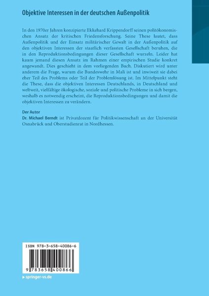 In den 1970er Jahren konzipierte Ekkehard Krippendorff seinen politökonomischen Ansatz der kritischen Friedensforschung. Seine These lautet, dass Außenpolitik und der Einsatz militärischer Gewalt in der Außenpolitik auf den objektiven Interessen der staatlich verfassten Gesellschaft beruhen, die in den Reproduktionsbedingungen dieser Gesellschaft wurzeln. Leider hat kaum jemand diesen Ansatz im Rahmen einer empirischen Studie konkret angewandt. Dies geschieht in dem vorliegenden Buch. Diskutiert wird unter anderem die Frage, warum die Bundeswehr in Mali ist und inwiweit sie dabei eher Teil des Problems oder Teil der Problemlösung ist.Im Mittelpunkt steht die These, dass die objektiven Interessen Deutschlands, in Deutschland und weltweit, vielfältige ökologische, soziale und politische Probleme in sich bergen, weshalb es notwendig erscheint, die Reproduktionsbedingungen und damit die objektiven Interessen zu verändern