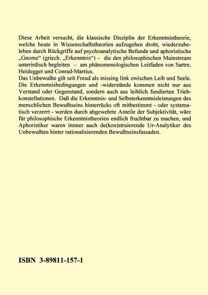 Diese Arbeit versucht, die klassische Disziplin der Erkenntnistheorie, welche heute in Wissenschaftstheorien aufzugehen droht, wiederzubeleben durch Rückgriff auf tiefenpsychologische Methoden und aphoristische "Gnome" (griechisch: "Erkenntnisvermögen") - die den philosophischen Mainstream unterirdisch begleiten - am phänomenologischen Leitfaden von Heidegger, Sartre und Conrad-Martius. Das Unbewusste gilt seit Freud als missing link zwischen Leib und Seele. Die Erkenntnisbedingungen und -widerstände kommen nicht nur aus Verstand und Gegenstand, sondern auch aus leiblich fundierten Triebkonstellationen. Dass die Erkenntnis- und Selbsterkenntnisleistungen des menschlichen Bewusstseins hinterrücks oft mitbestimmt oder sogar systematisch verzerrt werden durch abgewehrte Anteile unreflektierter Subjektivität, wäre für anthropologisch relevante Erkenntnistheorien endlich fruchtbar zu machen. Und Aphoristiker der europäischen Moralistik waren immer auch de(kon)struierende Ur-Analytiker des Unbewussten hinter rationalisierenden Bewusstseinsfassaden ihrer Epochen gewesen.