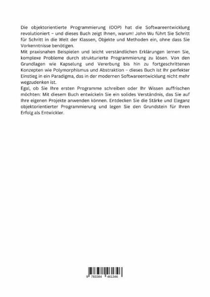Die objektorientierte Programmierung (OOP) hat die Softwareentwicklung revolutioniert - und dieses Buch zeigt Ihnen, warum! John Wu führt Sie Schritt für Schritt in die Welt der Klassen, Objekte und Methoden ein, ohne dass Sie Vorkenntnisse benötigen.Mit praxisnahen Beispielen und leicht verständlichen Erklärungen lernen Sie, komplexe Probleme durch strukturierte Programmierung zu lösen. Von den Grundlagen wie Kapselung und Vererbung bis hin zu fortgeschrittenen Konzepten wie Polymorphismus und Abstraktion - dieses Buch ist Ihr perfekter Einstieg in ein Paradigma, das in der modernen Softwareentwicklung nicht mehr wegzudenken ist.Egal, ob Sie Ihre ersten Programme schreiben oder Ihr Wissen auffrischen möchten: Mit diesem Buch entwickeln Sie ein solides Verständnis, das Sie auf Ihre eigenen Projekte anwenden können. Entdecken Sie die Stärke und Eleganz objektorientierter Programmierung und legen Sie den Grundstein für Ihren Erfolg als Entwickler.