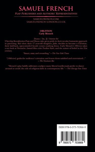 Uber-hip Brooklynites Pam and Dixon take great pride in their secular humanist approach to parenting. But when their 17-year-old daughter, Julie, decides to become a Christian, their laid-back, open-minded facade comes crashing down. Carly Mensch's Oblivion takes a wry look at Nietzsche, famed film critic Pauline Kael, and the nature of belief in the 21st century.