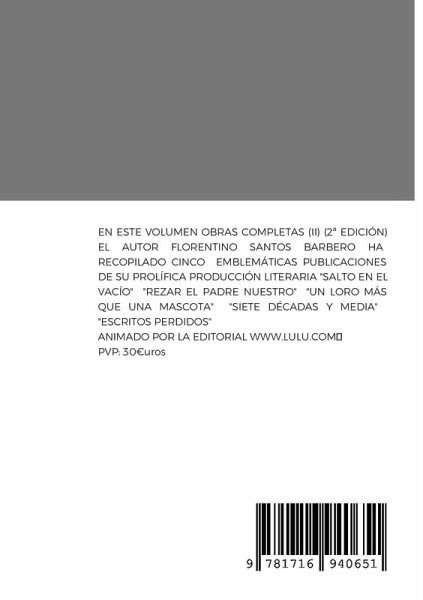 EN ESTE VOLUMEN EL AUTOR HA RECOPILADO ALGUNA DE SUS OBRAS LITERARIAS EMBLEMÁTICAS "SALTO EN EL VACÍO" "REZAR EL PADRE NUESTRO" "UN LORO MÁS QUE UNA MASCOTA" "SIETE DÉCADAS Y MEDIA" "ESCRITOS PERDIDOS"