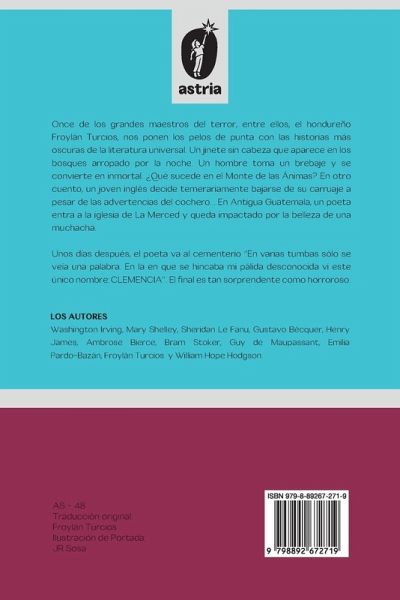 Once de los grandes maestros del terror, entre ellos, el hondureño Froylán Turcios, nos ponen los pelos de punta con las historias más oscuras de la literatura universal. Un jinete sin cabeza que aparece en los bosques arropado por la noche. Un hombre toma un brebaje y se convierte en inmortal. ¿Qué sucede en el Monte de las Ánimas? En otro cuento, un joven inglés decide temerariamente bajarse de su carruaje a pesar de las advertencias del cochero... En Antigua Guatemala, un poeta entra a la iglesia de La Merced y queda impactado por la belleza de una muchacha. Unos días después, el poeta va al cementerio "En varias tumbas sólo se veía una palabra. En la en que se hincaba mi pálida desconocida vi este único nombre: CLEMENCIA". El final es tan sorprendente como horroroso. LOS AUTORES. Washington Irving, Mary Shelley, Sheridan Le Fanu, Gustavo Bécquer, Henry James, Ambrose Bierce, Bram Stoker, Guy de Maupassant, Emilia Pardo-Bazán, Froylán Turcios y William Hope Hodgson.