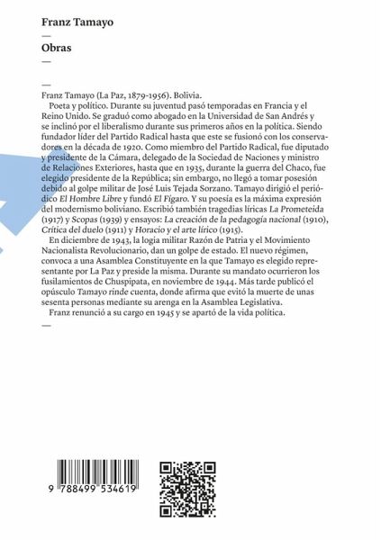 Esta edición de las Obras de Franz Tamayo (La Paz, 1879-1956) contiene los ensayos Creación de la pedagogía nacional; Proverbios sobre la vida, el arte y la ciencia y las Notas sobre el nuevo arte francés. Poeta y político, durante su juventud Tamayo pasó temporadas en Francia y el Reino Unido. Luego se graduó como abogado en la Universidad Mayor de San Andrés. En sus primeros años en la política Franz Tamayo se inclinó por el liberalismo. Fue líder fundador del Partido Radical hasta su fusión con los conservadores en la década de 1920. Fue diputado por el Partido Radical, presidente de la Cámara, delegado de la Sociedad de Naciones y ministro de Relaciones Exteriores. Más tarde fue elegido presidente de la República durante la Guerra del Chaco. Sin embargo, no llegó a tomar posesión debido al golpe militar de José Luis Tejada Sorzano. Franz Tamayo dirigió además el Periódico El Hombre Libre y fundó El Fígaro. Su poesía es la máxima expresión del modernismo boliviano. Escribió también las tragedias líricas La Prometeida (1917) y Scopas (1939).