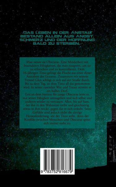 Der Auftakt einer neuen Fantasyreihe.Das Leben in der Anstalt bestand allein aus Angst, Schmerz und der Hoffnung, bald zu sterben.Man nennt sie Obscurae. Eine Minderheit mit besonderen Fähigkeiten, die man einsperrt, um sie zu erforschen und zu kontrollieren. Dem 16-jährigen Timo gelingt die Flucht aus einer dieser Anstalten des Grauens. Zusammen mit seinem Freund Glen schlägt er sich auf der Straße durch. Bis zu dem Tag, an dem Timo all das genommen wird. In seiner rasenden Wut und Trauer zerstört er ein halbes Dorf.Erst an dem Institut für junge Obscurae lernt er, mit seiner Fähigkeit umzugehen und sich selbst und anderen wieder zu vertrauen. Allen, bis auf Sam, der ihn in den Wahnsinn treibt und gleichzeitig etwas in ihm weckt, gegen das er sich sträubt. Seine Gefühle sind jedoch nicht die einzige Herausforderung, vor der Timo steht, denn der Konflikt zwischen Menschen und Obscurae spitzt sich immer mehr zu.Leserstimmen:»Obscurae - Ein Buch, das berührt, fesselt und manchmal erschreckend real erscheint.«»Düstere Atmosphäre, tolle Charaktere, spannende Geschichte!«»An diese Geschichte sollte man nicht mit Erwartungen rangehen, denn es kommt anders - es kommt besser!«