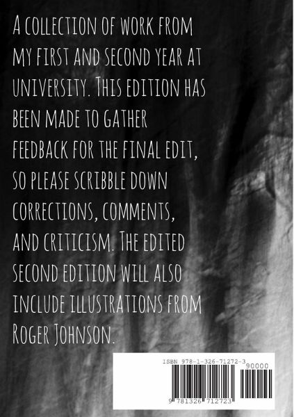 A collection of work from my first and second year at university. This edition has been made to gather feedback for the final edit, so please scribble down corrections, comments, and critisicm.