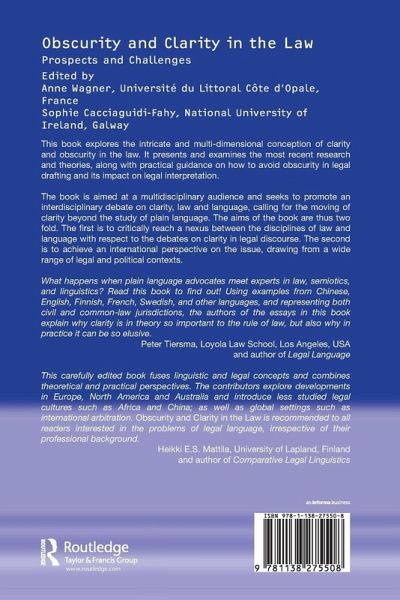 'What happens when plain language advocates meet experts in law, semiotics, and linguistics? Read this book to find out! Using examples from Chinese, English, Finnish, French, Swedish, and other languages, and representing both civil and common-law jurisdictions, the authors of the essays in this book explain why clarity is in theory so important to the rule of law, but also why in practice it can be so elusive.' Peter Tiersma, Loyola Law School, Los Angeles , USA and author of Legal Language 'This carefully edited book fuses linguistic and legal concepts and combines theoretical and practical perspectives. The contributors explore developments in Europe, North America and Australia and introduce less studied legal cultures such as Africa and China; as well as global settings such as international arbitration. Obscurity and Clarity in the Law is recommended to all readers interested in the problems of legal language, irrespective of their professional background. Heikki E. S. Mattila, University of Lapland, Finland and author of Comparative Legal Linguistics '...I would certainly recommend this volume to legal linguists because, as a whole, it is well-balanced and carefully thought out, with an interesting selection of papers.' International Journal for the Semiotics of Law