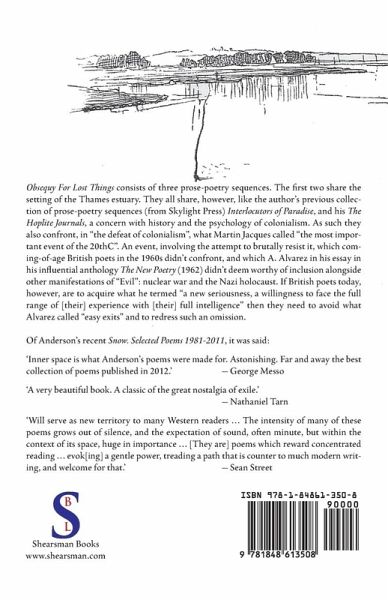 Obsequy For Lost Things consists of three prose-poetry sequences. The first two share the setting of the Thames estuary. They all share, however, like the author's previous collection of prose-poetry sequences (from Skylight Press) Interlocutors of Paradise, and his The Hoplite Journals, a concern with history and the psychology of colonialism. As such they also confront, in "the defeat of colonialism", what Martin Jacques called "the most important event of the 20thC". An event, involving the attempt to brutally resist it, which coming-of-age British poets in the 1960s didn't confront, and which A. Alvarez in his essay in his influential anthology The New Poetry (1962) didn't deem worthy of inclusion alongside other manifestations of "Evil": nuclear war and the Nazi holocaust. If British poets today, however, are to acquire what he termed "a new seriousness, a willingness to face the full range of [their] experience with [their] full intelligence" then they need to avoid what Alvarez called "easy exits" and to redress such an omission.