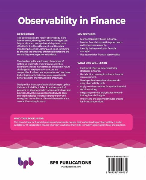 Observe, optimize, and transform in finance DESCRIPTION This book explains the role of observability in the finance sector, showing how new technologies can help monitor and manage financial systems more effectively. It outlines the use of real-time data monitoring, Machine Learning, and cloud computing to enhance the efficiency of financial operations and ensure they meet regulatory standards. The chapters guide you through the process of setting up systems to track financial activities accurately, analyze market trends, and predict future challenges to keep operations secure and competitive. It offers clear explanations of how these technologies can help finance professionals make better decisions and manage risks proactively. Designed for finance professionals looking to update their technical skills, this book provides practical guidance on adopting modern observability tools and practices. It will help you understand how to apply these technologies to increase transparency and strengthen the resilience of financial operations in a constantly evolving industry. WHAT YOU WILL LEARN ¿ Implement effective data monitoring strategies in finance. ¿ Use Machine Learning to enhance financial risk assessment. ¿ Develop robust compliance frameworks using observability tools. ¿ Apply real-time analytics for quicker financial decision-making. ¿ Integrate predictive analytics for forward-looking financial insights. ¿ Understand and deploy distributed tracing for financial operations. WHO THIS BOOK IS FOR This book is ideal for financial professionals seeking to deepen their understanding of observability. It is also suitable for IT specialists in finance who wish to advance their skills in modern observability tools and practices.