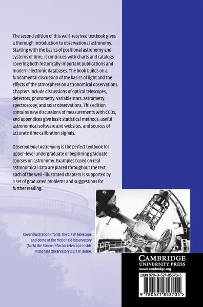 The long-awaited second edition of this well-received textbook gives a thorough introduction to observational astronomy. Starting with the basics of positional astronomy and systems of time, it continues with charts and catalogs covering both historically important publications and modern electronic databases. The book builds on a fundamental discussion of the basics of light and the effects of the atmosphere on astronomical observations. Chapters include discussions of optical telescopes, detectors, photometry, variable stars, astrometry, spectroscopy, and solar observations. This edition contains new discussions of measurements with CCDs and appendices give basic statistical methods, useful astronomical software and websites, and sources of accurate time-calibration signals. Observational Astronomy is the perfect textbook for upper level undergraduate or beginning graduate courses on astronomy. Examples based on real astronomical data are placed throughout the text. Each of the well-illustrated chapters is supported by a set of graduated problems and suggestions for further reading.