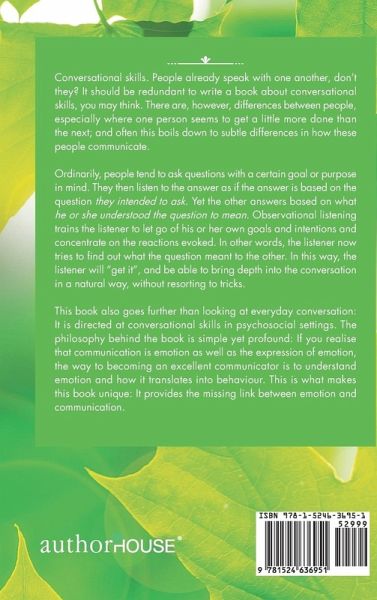 Conversational skills. People already talk with one another, don't they? It should be redundant to write a book about conversational skills-or so you would think. Yet there are differences between people: one seems to get a little more done than the next. Often this boils down to subtle differences in the way they communicate. Ordinarily, people tend to ask questions with a certain goal or purpose in mind. They then listen to the answer as if the answer is based on the question as they meant it to be. Yet the other is answering based on what he understood the question to mean. Observational listening trains the listener to let go of his own goals and interpretations and concentrate on the reactions evoked. In other words, the listener tries to find out what the question meant to the other. In this way, he "gets it" and is able to bring depth into the conversation in a natural way without resorting to tricks. This book also goes further than your everyday conversation: it is directed at conversational skills in psychosocial settings. The philosophy behind the book is simple yet profound: if you realise that communication is an emotion as well as the expression of emotion, the way to becoming an excellent communicator is to understand emotion and how it translates into behaviour. This is what makes this book unique: it provides the missing link between emotion and communication.