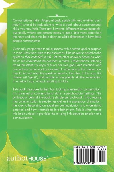 Conversational skills. People already talk with one another, don’t they? It should be redundant to write a book about conversational skills—or so you would think. Yet there are differences between people: one seems to get a little more done than the next. Often this boils down to subtle differences in the way they communicate. Ordinarily, people tend to ask questions with a certain goal or purpose in mind. They then listen to the answer as if the answer is based on the question as they meant it to be. Yet the other is answering based on what he understood the question to mean. Observational listening trains the listener to let go of his own goals and interpretations and concentrate on the reactions evoked. In other words, the listener tries to find out what the question meant to the other. In this way, he "gets it" and is able to bring depth into the conversation in a natural way without resorting to tricks. This book also goes further than your everyday conversation: it is directed at conversational skills in psychosocial settings. The philosophy behind the book is simple yet profound: if you realise that communication is an emotion as well as the expression of emotion, the way to becoming an excellent communicator is to understand emotion and how it translates into behaviour. This is what makes this book unique: it provides the missing link between emotion and communication.