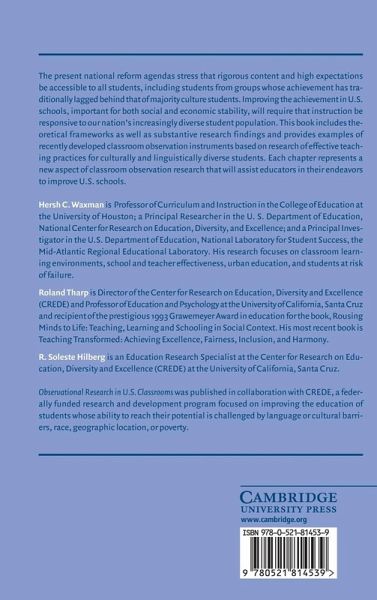 The present national reform agendas stress that rigorous content and high expectations be accessible to all students, including students from groups whose achievement has traditionally lagged behind that of the majority culture students. Improving the achievement in US schools, important for both social and economic stability, will require that instruction be responsive to our nation's increasingly diverse student population. This book includes theoretical frameworks as well as substantive research findings and provides examples of recently developed classroom observation instruments based on research of effective teaching practices for culturally and linguistically diverse students. Each chapter represents a new aspect of classroom observation research that will assist educators in their endeavors to improve US schools.