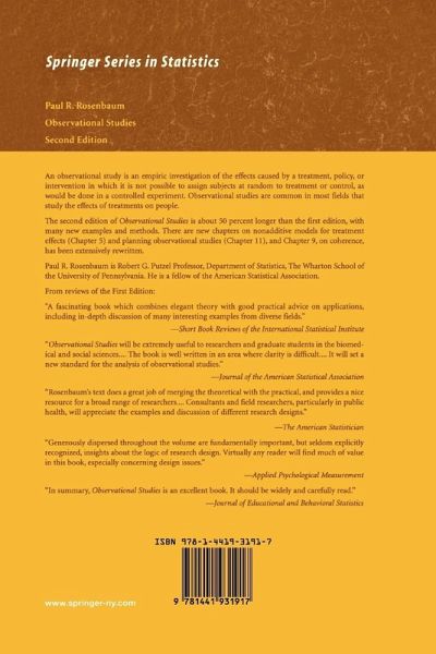 This second edition is about fifty percent larger than the original. The flavour is the same. The book provides a thoughtful discussion, at a mathematical and conceptual level, of what can and cannot be learned from observational studies. ISI Short Book Rezensions, Vol. 22/2, August 2002 From reviews of the First Edition: "A fascinating book which combines elegant theory with good practical advice on applications, including in-depth discussion of many interesting examples from diverse fields." Short Book Rezensions of the International Statistical Institute "Observational Studies" will be extremely useful to researchers and graduate students in the biomedical and social sciences... The book is well written in an area where clarity is difficult... It will set a new standard for the analysis of observational studies." Journal of the American Statistical Association "Rosenbaum's text does a great job of merging the theoretical with the practical, and provides a nice resource for a broad range of researchers... Consultants and field researchers, particularly in public health, will appreciate the examples and discussion of different research designs." The American Statistician "Generously dispersed throughout the volume are fundamentally important, but seldom explicitly recognized, insights about the logic of research design. Virtually any reader will find much of value in this book, especially concerning design issues." Applied Psychological Measurement "In summary, Observational Studies is an excellent book. It should be widely and carefully read." Journal of Educational and Behavioral Statistics.