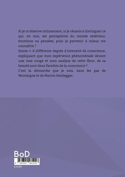 Si je m'observe intimement, si je réussis à distinguer ce qui, en moi, est perceptions du monde extérieur, émotions ou pensées, puis-je parvenir à mieux me connaître ?Existe-t-il différents degrés d'intensité de conscience, expliquant que mon expérience phénoménale devant une rose rouge et mon analyse de cette fleur, de sa beauté sont deux facettes de la conscience ?C'est la démarche que je suis, dans les pas de Montaigne et de Martin Heidegger.
