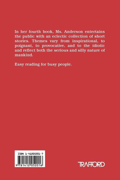 Ms. Anderson entertains the public with an eclectic collection of short stories. Themes vary from inspirational, to poignant, to provocative, and to the idiotic activities of mankind. Easy reading.