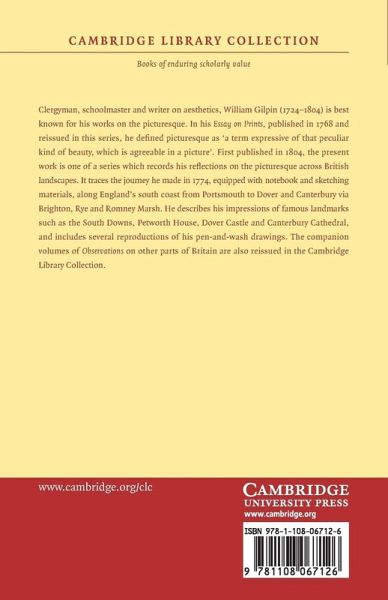 Clergyman, schoolmaster and writer on aesthetics, William Gilpin (1724-1804) is best known for his works on the picturesque. In his Essay on Prints, published in 1768 and reissued in this series, he defined picturesque as 'a term expressive of that peculiar kind of beauty, which is agreeable in a picture'. First published in 1804, the present work is one of a series which records his reflections on the picturesque across British landscapes. It traces the journey he made in 1774, equipped with notebook and sketching materials, along England's south coast from Portsmouth to Dover and Canterbury via Brighton, Rye and Romney Marsh. He describes his impressions of famous landmarks such as the South Downs, Petworth House, Dover Castle and Canterbury Cathedral, and includes several reproductions of his pen-and-wash drawings. The companion volumes of Observations on other parts of Britain are also reissued in the Cambridge Library Collection.