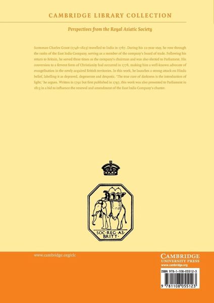 Scotsman Charles Grant (1746-1823) travelled to India in 1767. During his 22-year stay, he rose through the ranks of the East India Company, serving as a member of the company's board of trade. Following his return to Britain, he served three times as the company's chairman and was also elected to Parliament. His conversion to a fervent form of Christianity had occurred in 1776, making him a well-known advocate of evangelisation in the newly acquired British territories. In this work, he launches a strong attack on Hindu belief, labelling it as depraved, degenerate and despotic. 'The true cure of darkness is the introduction of light,' he argues. Written in 1792 but first published in 1797, this work was also presented to Parliament in 1813 in a bid to influence the renewal and amendment of the East India Company's charter.