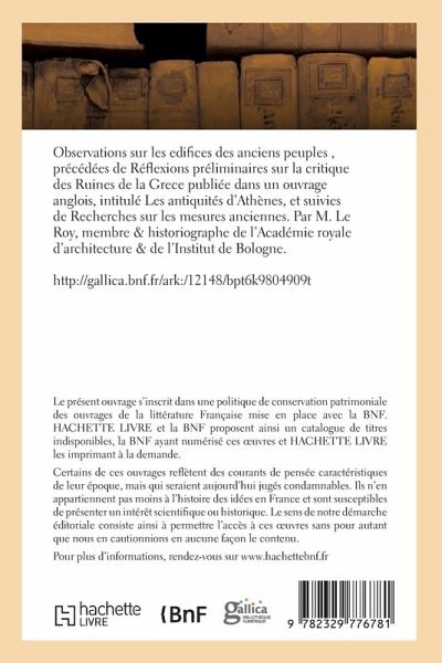 Observations sur les edifices des anciens peuples, précédées de Réflexions préliminaires sur la critique des Ruines de la Grece publiée dans un ouvrage anglois, intitulé Les antiquités d'Athènes, et suivies de Recherches sur les mesures anciennes. Par M. Le Roy, membre & historiographe de l'Académie royale d'architecture & de l'Institut de Bologne. Date de l'édition originale: 1767 Le présent ouvrage s'inscrit dans une politique de conservation patrimoniale des ouvrages de la littérature Française mise en place avec la BNF. HACHETTE LIVRE et la BNF proposent ainsi un catalogue de titres indisponibles, la BNF ayant numérisé ces oeuvres et HACHETTE LIVRE les imprimant à la demande. Certains de ces ouvrages reflètent des courants de pensée caractéristiques de leur époque, mais qui seraient aujourd'hui jugés condamnables. Ils n'en appartiennent pas moins à l'histoire des idées en France et sont susceptibles de présenter un intérêt scientifique ou historique. Le sens de notre démarche éditoriale consiste ainsi à permettre l'accès à ces oeuvres sans pour autant que nous en cautionnions en aucune façon le contenu. Pour plus d'informations, rendez-vous sur www.hachettebnf.fr