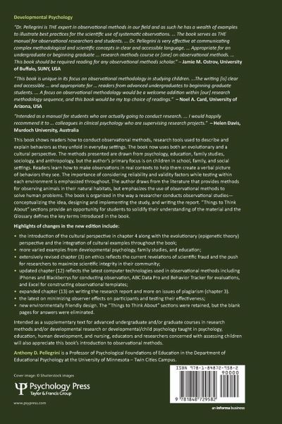 This book shows readers how to conduct observational methods, research tools used to describe and explain behaviors as they unfold in everyday settings. The book now uses both an evolutionary and a cultural perspective. The methods presented are drawn from psychology, education, family studies, sociology, and anthropology, but the author's primary focus is on children in school, family, and social settings. Readers learn how to make observations in real contexts to help them create a verbal picture of behaviors they see. The importance of considering reliability and validity factors while testing within each environment is emphasized throughout. The author draws from the literature that provides methods for observing animals in their natural habitats, but emphasizes the use of observational methods to solve human problems. The book is organized in the way a researcher conducts observational studies-conceptualizing of the idea, designing and implementing the study, and writing the report. "Things to think about" sections provide an opportunity for students to solidify their understanding of the material and the Glossary defines the key terms introduced in the book. Highlights of changes in the new edition include: ¿ The introduction of the cultural perspective in chapter 4 along with the evolutionary (epigenetic theory) perspective and the integration of cultural examples throughout the book. ¿ More varied examples from developmental psychology, family studies, and education. ¿ Extensively revised chapter (3) on ethics reflects the current revelations of scientific fraud and the push for researchers to maximize scientific integrity in their community. ¿ Updated chapter (12) reflects the latest computer technologies used in observational methods including iPhones and Blackberrys for conducting observation, ABC Data Pro and Behavior Tracker for evaluations, and Excel for constructing observational templates. ¿ Expanded chapter (13) on writing the research report and more on issues of plagiarism (ch. 3). ¿ The latest on minimizing observer effects on participants and testing their effectiveness. ¿ New environmentally friendly design, the Things to Think About sections were retained, but the blank pages for answers were eliminated. Intended as a supplementary text for advanced undergraduate and/or graduate courses in research methods and/or developmental research or developmental/child psychology taught in psychology, education, human development, and nursing, educators and researchers concerned with assessing children will also appreciate this book's introduction to observational methods.