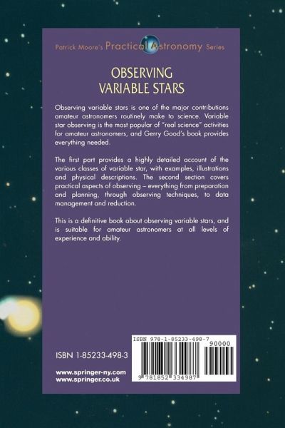 Observing variable stars is one of the major contributions amateur astronomers make to science. There are 36,000 variable stars listed in the General Catalogue of Variable Stars, so it is clearly impossible for the limited number of professional observatories to target even the majority of them. That's where amateur astronomers come in - thousands of them turning their telescopes to the sky every night. Variable star observing is the most popular of "real science" activities for amateurs, and Gerry Good's book provides everything needed. The first part of the book provides a highly detailed account of the various classes of variable star, with examples, illustrations and physical descriptions. The second section covers practical aspects of observing, everything from preparation and planning, through observing techniques, to data management and reduction.
