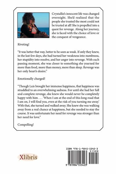 Crystallie's innocent life was changed overnight. She'd realized that the people she trusted the most could not be trusted at all! She is propelled into a quest for revenge. Along her journey, she is faced with the choice of love or the conquest of vengeance. Riveting! "It was better that way, better to be seen as weak. If only they knew, in the last few days, she had turned her weakness into numbness, her stupidity into resolve, and her anger into revenge. With each passing moment, she was closer to something she yearned for more than food, more than money, more than sleep. Revenge was her only heart's desire." Emotionally charged! "Though Luis brought her immense happiness, that happiness was straddled to an overwhelming sadness. For until she had her full and complete revenge, she knew she would never be completely happy with him . . . 'When I am at the end of this long road that I am on, I will find you, even at the risk of you turning me away.' With that, she turned and walked away. She knew she was walking away from a real chance at happiness, but she needed to stay the course. It was unfortunate her need for revenge was stronger than her need for love." Compelling!