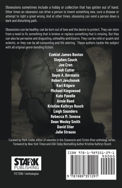 Webster defines "obsession" as an "a persistent disturbing abnormal preoccupation with an often unreasonable idea or feeling." Obsessions sometimes include a hobby or collection that has gotten out of hand. Other times an obsession can drive a person to invent something new, cure a disease or attempt to right a great wrong. And at other times, obsessing can send a person down a dark and disturbing path. Obsessions can be healthy; can be born out of love and the desire to protect. They can stem from a need to fix something that is broken or replace something that is missing. But they can also be pervasive and disgusting, unhealthy and bizarre. They can be mild or quaint and eclectic, or they can be all-consuming and life altering. These authors tackle the subject with all original genre-bending fiction:Ezekiel James Boston Stephen Couch Joe Cron Leah Cutter Dayle Dermatis Robert Jeschonek Kari Kilgore Michael Kingswood Kate Pavelle Annie Reed Kristine Kathryn Rusch Leigh Saunders Rebecca M. Senese Dean Wesley Smith David Stier Julie Strauss Stories curated by Mark Leslie, editor of Campus Chills, North of Infinity II, Tesseracts Sixteen: Parnassus Unbound and multiple volumes in the Fiction River anthology series. Foreword by New York Times and USA Today Bestselling Author Kristine Kathryn Rusch.