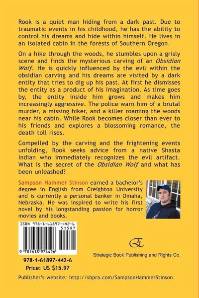 Rook is a quiet man hiding from a dark past. Due to traumatic events in his childhood, he has the ability to control his dreams and hide within himself. He lives in an isolated cabin in the forests of Southern Oregon. On a hike through the woods, he stumbles upon a grisly scene and finds the mysterious carving of an Obsidian Wolf. He is quickly influenced by the evil within the obsidian carving and his dreams are visited by a dark entity that tries to dig up his past. At first he dismisses the entity as a product of his imagination. As time goes by, the entity inside him grows and makes him increasingly aggressive. The police warn him of a brutal murder, a missing hiker, and a killer roaming the woods near his cabin. While Rook becomes closer than ever to his friends and explores a blossoming romance, the death toll rises. Compelled by the carving and the frightening events unfolding, Rook seeks advice from a native Shasta Indian who immediately recognizes the evil artifact. What is the secret of the Obsidian Wolf and what has been unleashed? Sampson Hammer Stinson earned a bachelor's degree in English from Creighton University and is currently a personal banker in Omaha, Nebraska. He was inspired to write his first novel by his longstanding passion for horror movies and books. Publisher's website: http://sbpra.com/SampsonHammerStinson