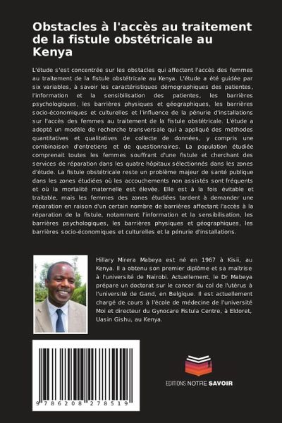 L'étude s'est concentrée sur les obstacles qui affectent l'accès des femmes au traitement de la fistule obstétricale au Kenya. L'étude a été guidée par six variables, à savoir les caractéristiques démographiques des patientes, l'information et la sensibilisation des patientes, les barrières psychologiques, les barrières physiques et géographiques, les barrières socio-économiques et culturelles et l'influence de la pénurie d'installations sur l'accès des femmes au traitement de la fistule obstétricale. L'étude a adopté un modèle de recherche transversale qui a appliqué des méthodes quantitatives et qualitatives de collecte de données, y compris une combinaison d'entretiens et de questionnaires. La population étudiée comprenait toutes les femmes souffrant d'une fistule et cherchant des services de réparation dans les quatre hôpitaux sélectionnés dans les zones d'étude. La fistule obstétricale reste un problème majeur de santé publique dans les zones étudiées où les accouchements non assistés sont fréquents et où la mortalité maternelle est élevée. Elle est à la fois évitable et traitable, mais les femmes des zones étudiées tardent à demander une réparation en raison d'un certain nombre de barrières affectant l'accès à la réparation de la fistule, notamment l'information et la sensibilisation, les barrières psychologiques, les barrières physiques et géographiques, les barrières socio-économiques et culturelles et la pénurie d'installations.