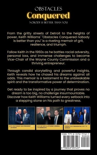 In Obstacles Conquered - Nobody Is Better Than You, Keith Williams shares a compelling and deeply personal memoir that chronicles his extraordinary journey from the streets of Detroit to a life of leadership, resilience, and triumph. Born into a working-class family and raised during a time of intense racial and social tension, Keith's life story is one of unwavering determination, family strength, and self-belief. Through vivid storytelling, Williams reflects on his early years growing up in the historically rich but racially divided neighborhoods of Detroit. From overcoming childhood stereotypes and school struggles to navigating systemic racism, personal loss, and professional setbacks, his journey is both inspiring and transformative. Despite the odds, Keith rises to become a respected entrepreneur, educator, and community leader, serving as a Wayne County Commissioner and Chairman of the Michigan Democratic Party Black Caucus. With wisdom gained through lived experience, he shares valuable life lessons on perseverance, identity, and the power of giving back. This memoir is more than a reflection-it's a call to action for readers of all backgrounds to embrace their truth, stand tall in the face of adversity, and never forget: Nobody is better than you. Perfect for readers who enjoy: * Autobiographies about overcoming adversity * African American history and lived experiences * Inspirational leadership journeys * Social justice and community activism