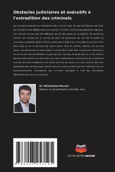 Les accords bilatéraux sur l'extradition des criminels avec les pays du Pakistan, de l'Irak, de la Turquie et de l'Afghanistan ainsi qu'avec la France. Les principes généraux régissant ces contrats ne sont pas très différents les uns des autres et, en général, les parties au contrat sont tenues par le contrat de punir les personnes qui ont été accusées ou reconnues coupables d'avoir commis, participé ou aidé à un crime dans le territoire d'un autre pays et sur le territoire de l'autre partie. sont un contrat, revenez les uns aux autres. Les personnes accusées d'avoir commis des crimes dont la peine est inférieure à un an ne sont pas extradables, et quel que soit l'accusé, la peine pour le crime commis doit être d'au moins un an de prison, et si une condamnation a été prononcée, la peine du criminel doit être condamné à au moins six mois de prison. Le crime commis doit être punissable dans les deux pays contractants et la peine ne doit pas être inférieure à un an d'emprisonnement. L'extradition des criminels politiques a créé des procédures différentes selon les circonstances.