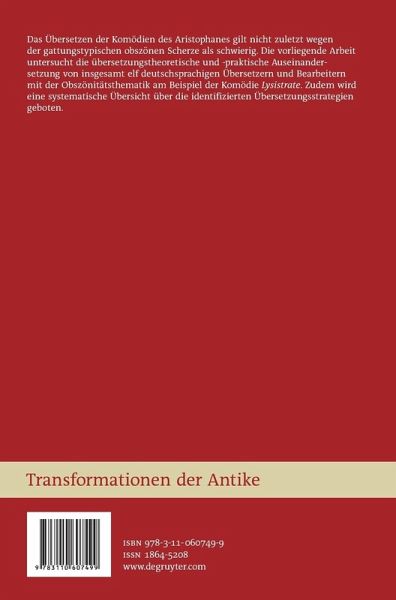 Das Übersetzen der Komödien des Aristophanes (_um 450 v. Chr.) gilt nicht zuletzt wegen der vielen obszönen Scherze als schwierig. Vor allem die an Obszönitäten besonders reichen 'Frauenkomödien' (Lysistrate, Ekklesiazusen, Thesmophoriazusen) wurden bis zum Ende des 18. Jahrhundert kaum rezipiert oder in moderne Volkssprachen übersetzt. Bei den übrigen Komödien wurde das gattungsspezifische Element des Obszönen durch die Übersetzer lange Zeit weitestgehend zurückgedrängt. Erst in jüngster Zeit erscheinen auch Übersetzungen, die sich um eine semantisch adäquate Wiedergabe der obszönen Termini bemühen. Die vorliegende Arbeit untersucht die übersetzungstheoretische und -praktische Auseinandersetzung von insgesamt 11 deutschsprachigen Übersetzern und Bearbeitern des Aristophanes (u.a. W. von Humboldt, Droysen, Schadewaldt, Holzberg, Fried, Jens) mit der Obszönitätsthematik am Beispiel der Komödie Lysistrate. Dabei werden jeweils auch Rückschlüsse auf das durch die Übersetzung und dieBehandlung des Obszönen vermittelte Aristophanes- bzw. Antikebild gezogen. Abschließend bietet der Band eine systematische Zusammenstellung der identifizierten Übersetzungsstrategien nach typologischen Gesichtspunkten.