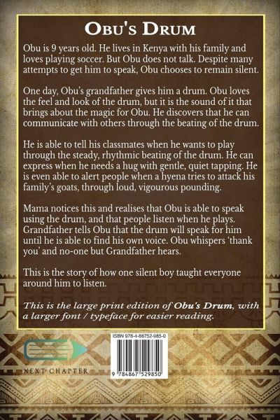 Obu is 9 years old. He lives in Kenya with his family and loves playing soccer. But Obu does not talk. Despite many attempts to get him to speak, Obu chooses to remain silent. One day, Obu's grandfather gives him a drum. Obu loves the feel and look of the drum, but it is the sound of it that brings about the magic for Obu. He discovers that he can communicate with others through the beating of the drum. He is able to tell his classmates when he wants to play through the steady, rhythmic beating of the drum. He can express when he needs a hug with gentle, quiet tapping. He is even able to alert people when a hyena tries to attack his family's goats, through loud, vigourous pounding. Mama notices this and realises that Obu is able to speak using the drum, and that people listen when he plays. Grandfather tells Obu that the drum will speak for him until he is able to find his own voice. Obu whispers 'thank you' and no-one but Grandfather hears. This is the story of how one silent boy taught everyone around him to listen. This is the large print edition of Obu's Drum, with a larger font / typeface for easier reading.