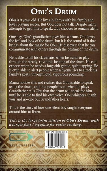 Obu is 9 years old. He lives in Kenya with his family and loves playing soccer. But Obu does not talk. Despite many attempts to get him to speak, Obu chooses to remain silent. One day, Obu's grandfather gives him a drum. Obu loves the feel and look of the drum, but it is the sound of it that brings about the magic for Obu. He discovers that he can communicate with others through the beating of the drum. He is able to tell his classmates when he wants to play through the steady, rhythmic beating of the drum. He can express when he needs a hug with gentle, quiet tapping. He is even able to alert people when a hyena tries to attack his family's goats, through loud, vigourous pounding. Mama notices this and realises that Obu is able to speak using the drum, and that people listen when he plays. Grandfather tells Obu that the drum will speak for him until he is able to find his own voice. Obu whispers 'thank you' and no-one but Grandfather hears. This is the story of how one silent boy taught everyone around him to listen. This is the large print edition of Obu's Drum, with a larger font / typeface for easier reading.
