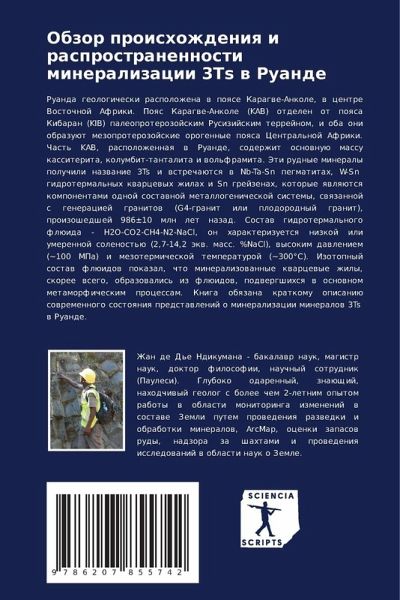 Ruanda geologicheski raspolozhena w poqse Karagwe-Ankole, w centre Vostochnoj Afriki. Poqs Karagwe-Ankole (KAB) otdelen ot poqsa Kibaran (KIB) paleoproterozojskim Rusizijskim terrejnom, i oba oni obrazuüt mezoproterozojskie orogennye poqsa Central'noj Afriki. Chast' KAB, raspolozhennaq w Ruande, soderzhit osnownuü massu kassiterita, kolumbit-tantalita i wol'framita. Jeti rudnye mineraly poluchili nazwanie 3Ts i wstrechaütsq w Nb-Ta-Sn pegmatitah, W-Sn gidrotermal'nyh kwarcewyh zhilah i Sn grejzenah, kotorye qwlqütsq komponentami odnoj sostawnoj metallogenicheskoj sistemy, swqzannoj s generaciej granitow (G4-granit ili plodorodnyj granit), proizoshedshej 986±10 mln let nazad. Sostaw gidrotermal'nogo flüida - H2O-CO2-CH4-N2-NaCl, on harakterizuetsq nizkoj ili umerennoj solenost'ü (2,7-14,2 äkw. mass. %NaCl), wysokim dawleniem (~100 MPa) i mezotermicheskoj temperaturoj (~300°C). Izotopnyj sostaw flüidow pokazal, chto mineralizowannye kwarcewye zhily, skoree wsego, obrazowalis' iz flüidow, podwergshihsq w osnownom metamorficheskim processam. Kniga obqzana kratkomu opisaniü sowremennogo sostoqniq predstawlenij o mineralizacii mineralow 3Ts w Ruande.