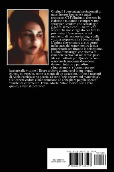 Originali i personaggi protagonisti di quest'horror ironico e a tratti grottesco. C'è l'allucinato che esce in ciabatte e mutande a comprare uno spray per uccidere uno scarafaggio gigante. Il medico "I - netto" che scopre che non è tagliato per fare lo psichiatra. L'assassina che nel momento di recidere la lingua della vittima scopre che ha i denti cariati. L'anima che compare al suo corpo nella tazza del water mentre la sua proprietaria sta tirando lo sciacquone. L'uomo "tartaruga" che rischia di rimanere ucciso dal suo stesso peso. Ma c'è molto di più. Questi racconti sono favole moderne dove dei e demoni, inferno e paradiso s'incrociano, si sfiorano, per poi lasciare alle vittime il libero arbitrio di muoversi in un mondo chiuso, minuscolo, come la mente di un assassino. Infine, i racconti di Adele Patrizia sono poesie. "Esistenza è tormento. Fobia. Morte. Vita e morte. E se è vero questo, è vero il contrario".