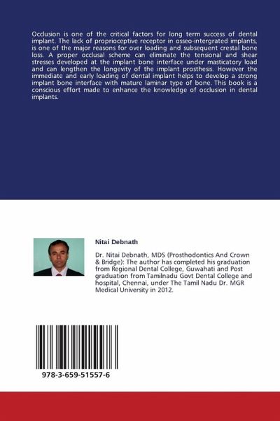 Occlusion is one of the critical factors for long term success of dental implant. The lack of proprioceptive receptor in osseo-intergrated implants, is one of the major reasons for over loading and subsequent crestal bone loss. A proper occlusal scheme can eliminate the tensional and shear stresses developed at the implant bone interface under masticatory load and can lengthen the longevity of the implant prosthesis. However the immediate and early loading of dental implant helps to develop a strong implant bone interface with mature laminar type of bone. This book is a conscious effort made to enhance the knowledge of occlusion in dental implants.