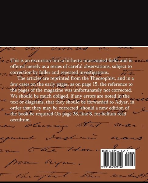 This is an excursion into a hitherto unoccupied field, and is offered merely as a series of careful observations, subject to correction by fuller and repeated investigations. The articles are reprinted from the Theosophist, and in a few cases on the early pages, as on page 15, the reference to the pages of the magazine was unfortunately not corrected. We should be much obliged, if any errors are noted in the text or diagrams, that they should be forwarded to Adyar, in order that they may be corrected, should a new edition of the book be required* On page 28, line 8, for helium read occultum.