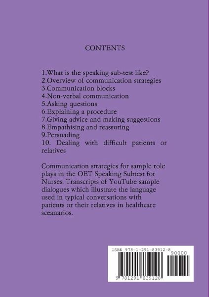 The communication strategies used in typical role plays during the OET Speaking subtest for nurses. Develop the ability to structure a dialogue with a patient or patient's relative within a healthcare scenario.Several common areas of communication are covered as well as starting and ending the role play and dealing with difficult conversations.