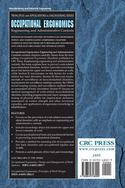 Occupational Ergonomics: Engineering and Administrative Controls focuses on prevention of work-related musculoskeletal disorders with an emphasis on engineering and administrative controls. Section I provides knowledge about risk factors for upper and lower extremities at work, while Section II concentrates on risk factors for work-related low back disorders. Section III discusses fundamentals of surveillance of musculoskeletal disorders, requirements for surveillance database systems, OSHA Record keeping system, and surveillance methods based on the assessment of body discomfort. Section IV focuses on medical management of work-related musculoskeletal disorders, including programs for post-injury management, testing of physical ability for employment decisions, assessment of worker strength and other functional capacities, and applications of ergonomics knowledge in rehabilitation.
