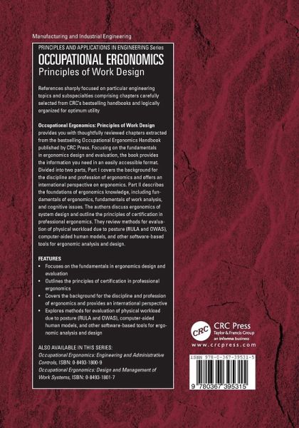 Ergonomics. The Ergonomics of System Design. A Guide to Scientific Sources of Ergonomics Knowledge. A Guide to Certification in Professional Ergonomics. Effective Use of the World Wide Web. Professional Ergonomics Issues. Development of Ergonomics Programs. Design of Information Devices and Controls. Engineering Anthropometry. Occupational Biomechanics. Human Strength Evaluation. Methods Based on Maximum Holding Time for Evaluation of Working Postures. Low-Level Static Exertions. Job Demands and Physical Fitness. Psychosocial Work Factors. Cognitive Factors. Task Analysis. Computer-Based Tool for Practical Ergonomic Job Analysis. Job or Task Analysis for Risk Factors of Musculoskeletal Disorders. The AET Method of Job Evaluation. Worker Strength Evaluation. Dynamic Workplace Factors in Manual Lifting. Push-Pull Force Limits. Force Exertion in User-Product Interaction. Rapid Upper Limb Assessment (RULA). OWAS Methods. Ergonomics of Hand Tools. Computer-Aided Design and Human Models. A Guide to Computer Software for Ergonomics. Guide for Videotaping and Gathering Data on Jobs for Analysis for Risks of Musculoskeletal Disorders. Physiological Instrumentation. Video-Based Measurements of Human Movement. Force Dynamometers and Accelerometers. How Complex Human-Machine Systems Fail. Human and System Reliabilty Analysis. Some Developments in Human Reliabilty Assessment. DIALOG. Managing the Speed-Accuracy Trade-Off. Receiver Characteristics in Safety Communications. Design of Industrial Warnings. Ergonomics Methods in the Design of Consumer Products.