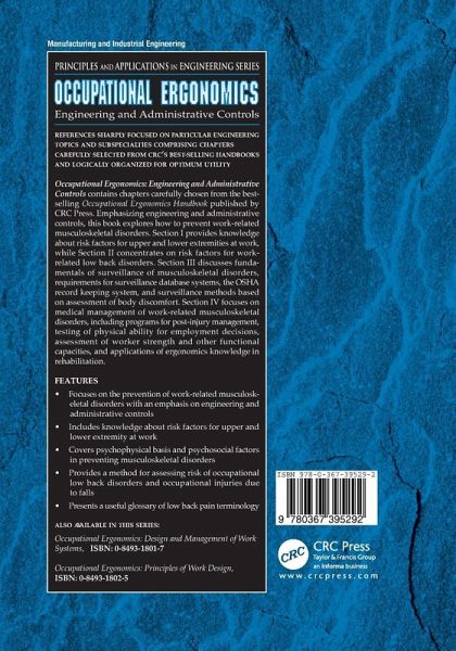 Occupational Ergonomics focuses on prevention of work-related musculoskeletal disorders with an emphasis on engineering and administrative controls. Divided into four broad sections, it provides knowledge about risk factors for upper and lower extremities at work; concentrates on risk factors for work-related lower back disorders; discusses fundamentals of surveillance of musculoskeletal disorders and surveillance methods based on the assessment of body discomfort; and focuses on medical management of work-related musculoskeletal disorders, testing of physical ability for employment decisions, assessment of functional capacities, and applications of ergonomics knowledge in rehabilitation.