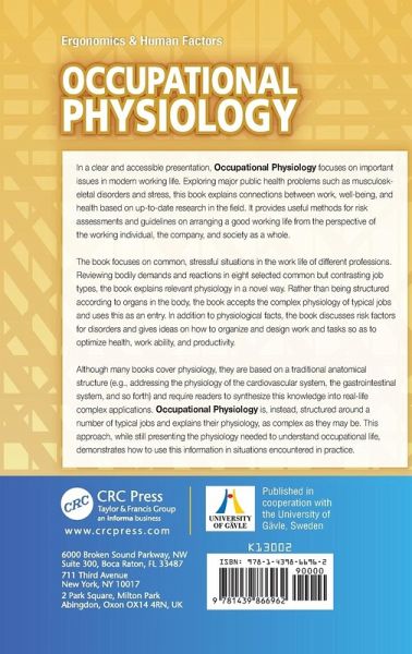 In a clear and accessible presentation, Occupational Physiology focuses on important issues in the modern working world. Exploring major public health problems-such as musculoskeletal disorders and stress-this book explains connections between work, well-being, and health based on up-to-date research in the field. It provides useful methods for risk assessment and guidelines on arranging a good working life from the perspective of the working individual, the company, and society as a whole. The book focuses on common, stressful situations in different professions. Reviewing bodily demands and reactions in eight selected common, but contrasting job types, the book explains relevant physiology in a novel way. Rather than being structured according to organs in the body, the book accepts the complex physiology of typical jobs and uses this as an entry. In addition to physiological facts, the book discusses risk factors for disorders and gives ideas on how to organize and design work and tasks so as to optimize health, work ability, and productivity. Although many books cover physiology, they are based on a traditional anatomical structure (e.g., addressing the physiology of the cardiovascular system, the gastrointestinal system, and so forth) and require readers to synthesize this knowledge into real-life complex applications. Occupational Physiology is, instead, structured around a number of typical jobs and explains their physiologies, as complex as they may be. This approach, while still presenting the physiology needed to understand occupational life, demonstrates how to use this information in situations encountered in practice.