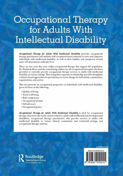 Occupational Therapy for Adults With Intellectual Disability provides occupational therapy practitioners and students with occupation-based solutions to serve and empower individuals with intellectual disabilities, as well as their families and caregivers, towards more self-determined, authentic lives.