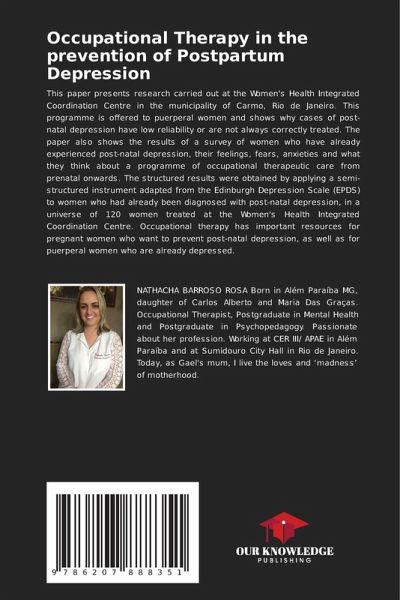 This paper presents research carried out at the Women's Health Integrated Coordination Centre in the municipality of Carmo, Rio de Janeiro. This programme is offered to puerperal women and shows why cases of post-natal depression have low reliability or are not always correctly treated. The paper also shows the results of a survey of women who have already experienced post-natal depression, their feelings, fears, anxieties and what they think about a programme of occupational therapeutic care from prenatal onwards. The structured results were obtained by applying a semi-structured instrument adapted from the Edinburgh Depression Scale (EPDS) to women who had already been diagnosed with post-natal depression, in a universe of 120 women treated at the Women's Health Integrated Coordination Centre. Occupational therapy has important resources for pregnant women who want to prevent post-natal depression, as well as for puerperal women who are already depressed.