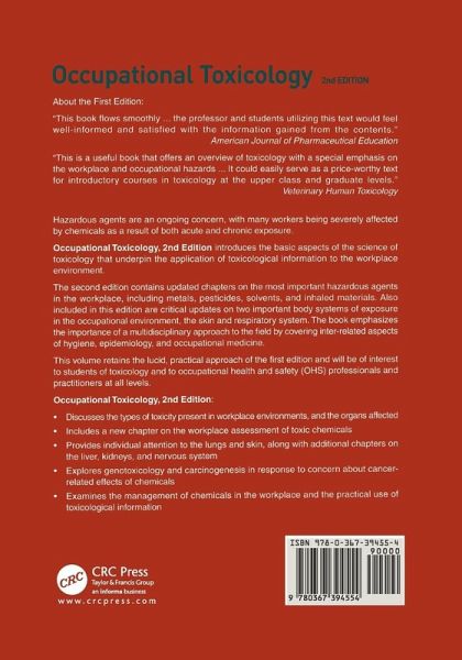 Focusing on chemicals found in the workplace, Occupational Toxicology introduces the basic tenets of the science of toxicology that underpin the application of toxicological information to the workplace. The book contains chapters on the most important workplace exposures, such as metals, pesticides, solvents, plastics, gases, and particulate matter, and informs the reader as to the types of toxicity seen in the workplace environment and the organs likely to be affected. The lung and the skin are given individual attention, as these are important sites of injury/disease caused by exposure to chemicals. It also covers genotoxicity, cancer, and their testing.