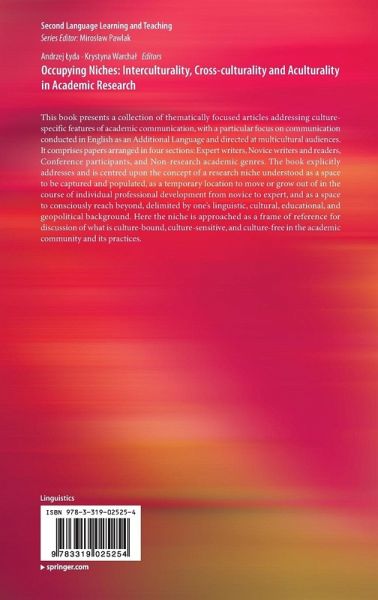 This book presents a collection of thematically focused articles addressing culture-specific features of academic communication, with a particular focus on communication conducted in English as an Additional Language and directed at multicultural audiences. It comprises papers arranged in four sections: Expert writers, Novice writers and readers, Conference participants, and Non-research academic genres. The book explicitly addresses and is centred upon the concept of a research niche understood as a space to be captured and populated, as a temporary location to move or grow out of in the course of individual professional development from novice to expert, and as a space to consciously reach beyond, delimited by one's linguistic, cultural, educational, and geopolitical background. Here the niche is approached as a frame of reference for discussion of what is culture-bound, culture-sensitive, and culture-free in the academic community and its practices.