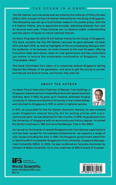 The IPS-Nathan Lectures series was launched by the Institute of Policy Studies (IPS) in 2014. It is part of the S R Nathan Fellowship for the Study of Singapore. The Fellowship was set up to fund further research into public policy, with the S R Nathan Fellow, who is appointed annually, delivering between four and six lectures each year. These lectures aim to advance public understanding and discussion of issues of critical national interest. Ho Kwon Ping was the 2014/15 S R Nathan Fellow for the Study of Singapore. This book contains the five IPS-Nathan Lectures he gave between October 2014 and April 2015, as well as highlights of the accompanying dialogue with the audience. In his lectures, Ho looks forward to the next 50 years, offering innovative ideas and robust views on how governance and key institutions can evolve to ensure the sustainable continuation of Singapore — the "improbable nation". This book illuminates Ho's vision of a cohesively diverse Singapore lasting beyond the lifespan of his generation, and aims to get the young to ponder and discuss the kind of home, and future, they wish for.
