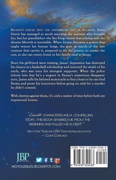 Recently forced into the underwater city of Atlantis, Emma Harris has managed to avoid marrying the merman who brought her, but her grandfather-the Sea King-insists that joining with the abusive Merrick is inevitable. When Emma discovers a poison that might restore her human lungs, she goes in search of the rare creature that carries it, prepared to try the poison no matter the cost, so she can return home to her family-and to James. Since his girlfriend went missing, James' depression has destroyed his chance at a basketball scholarship and incurred the wrath of his uncle, who was once his strongest supporter. When the police inform him that he's a suspect in Emma's mysterious disappearance, James sells his beloved motorcycle to buy a boat so he can find Emma and prove his innocence before going on trial for a murder he didn't commit. With destiny against them, it's only a matter of time before both are imprisoned forever.