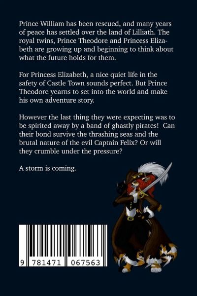 Prince William has been rescued, and many years of peace have settled over the land of Lilliath. The royal twins, Prince Theodore and Princess Elizabeth are growing up and beginning to think about what the future holds for them. For Princess Elizabeth, a nice quiet life in the safety of Castle Town sounds perfect. But Prince Theodore yearns to set into the world and make his own adventure story. However the last thing they were expecting was to be spirited away by a band of ghastly pirates! Can their bond survive the thrashing seas and the brutal nature of the evil Captain Felix? Or will they crumble under the pressure? A storm is coming.